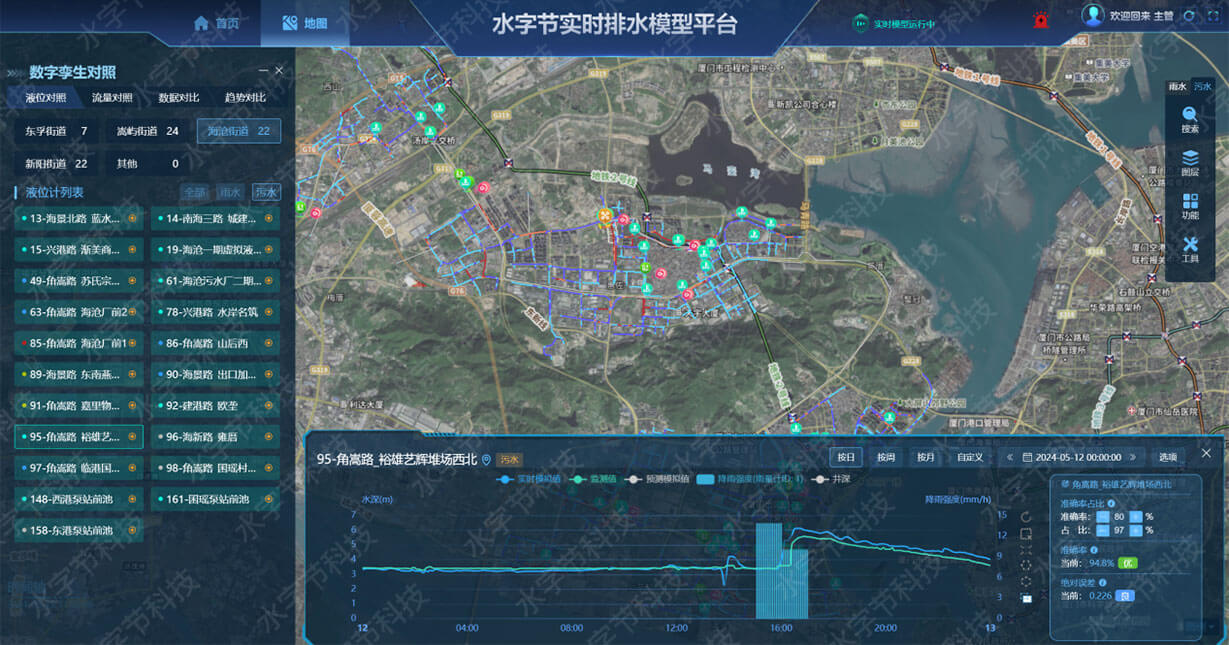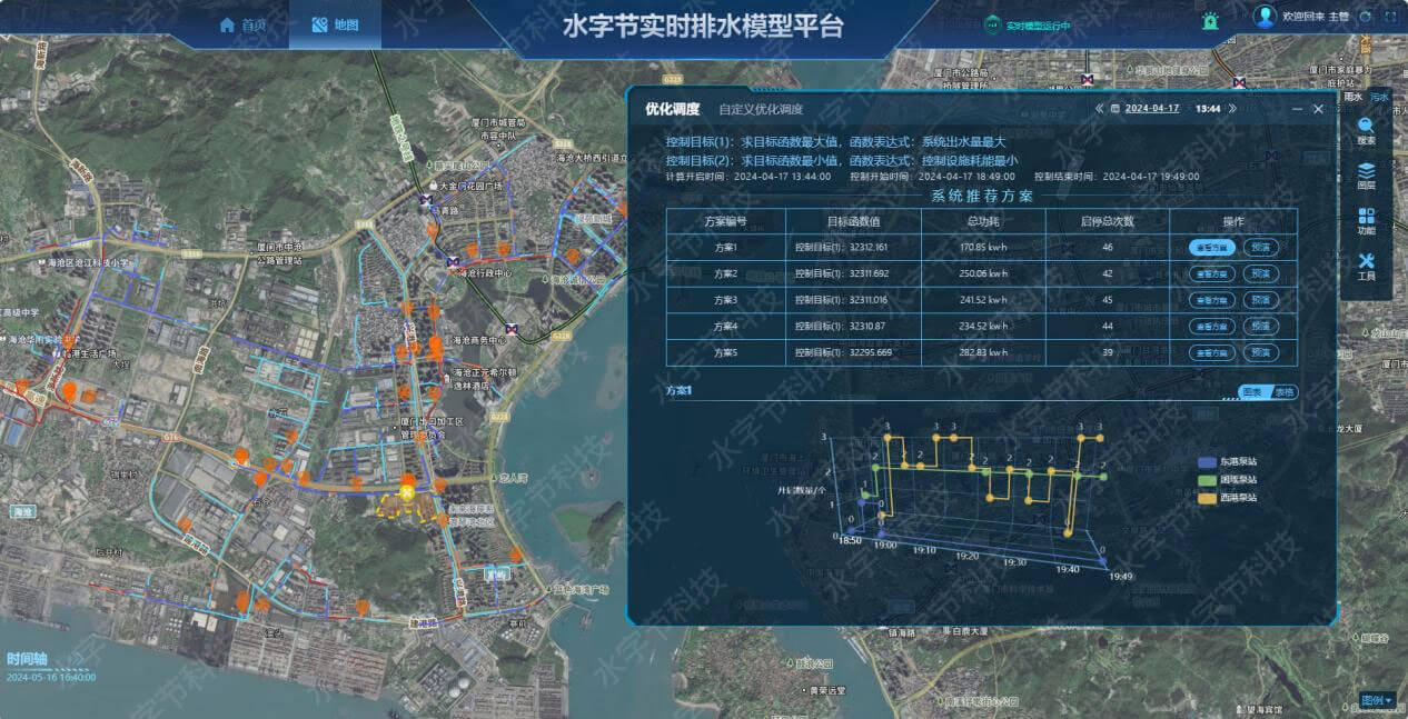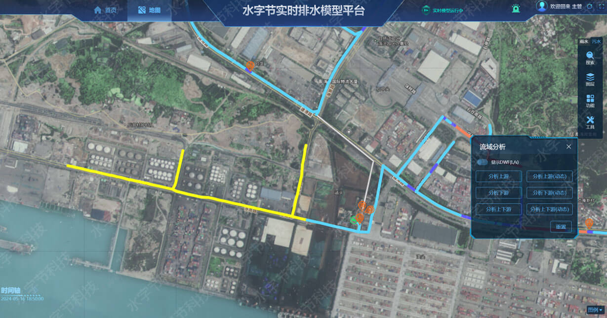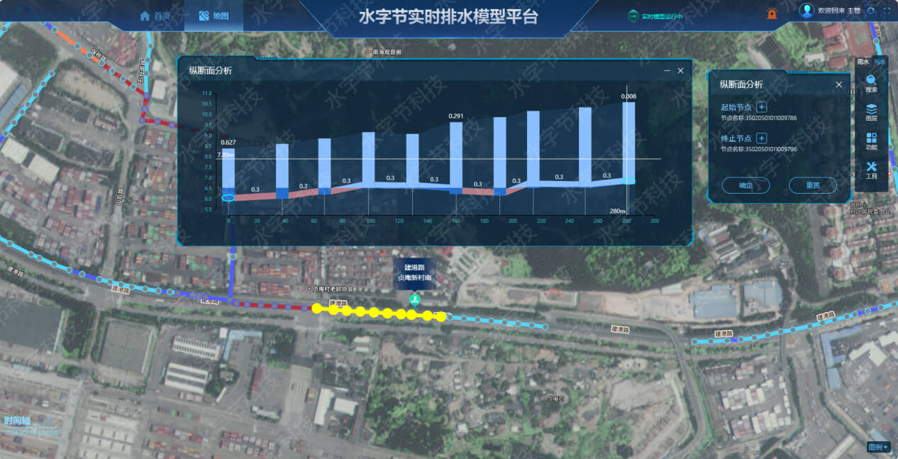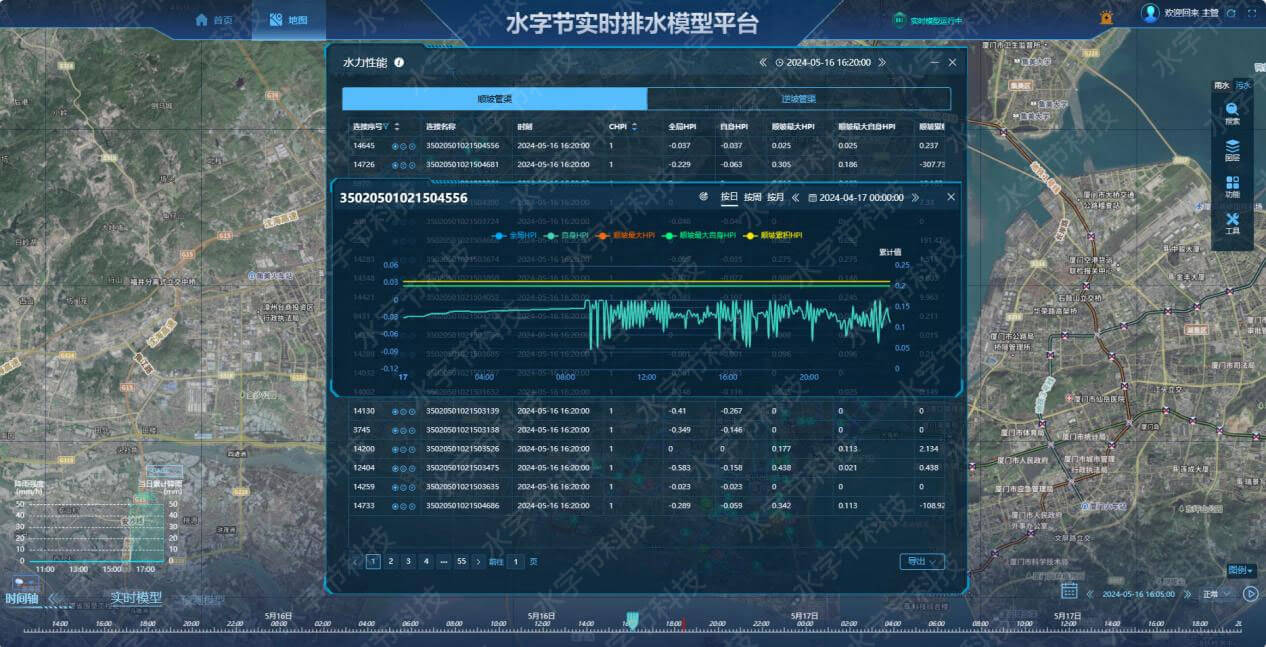 以自主研发的排水引擎为核心,通过对现有排水管网数据进行建模,历经数据预处理、离线调参、实时在线和数据分析四个阶段,既可以快速演算和预测排水系统的运行状态,又可以对受控设备进行优化调度,还可以深度分析模型数据,结合模型提供的智能诊断功能,进行管网病害分析,为管网养护提出科学的指导建议。